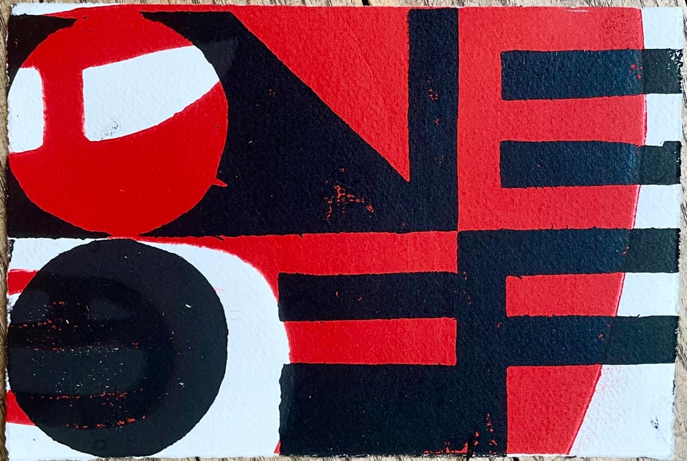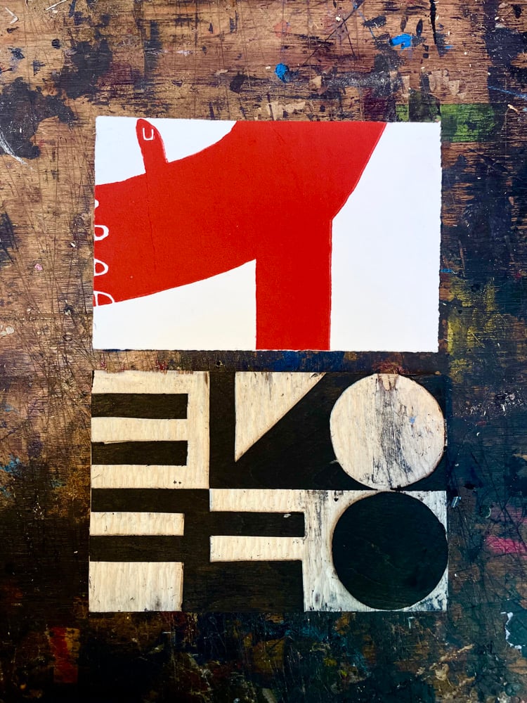 A two colour woodcut print on an A5 sheet of Somerset paper. There are six of these in total but each is an edition of one due to the usage of repurposed large prints cut up to make unique backgrounds. The only downside is that your print will be a surprise unless you really push me on sending a mugshot!
